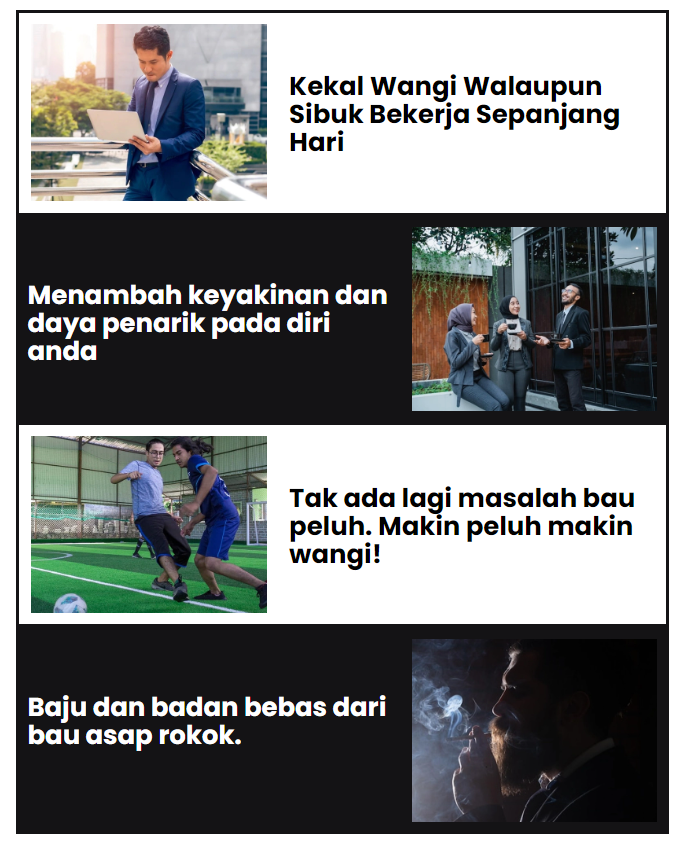 Kesan Wangian Yang Cukup Kuat Dan Berkesan Untuk Hilangkan Bau Peluh & Bau Rokok, Tanpa Bau Yang Memeningkan Kepala.